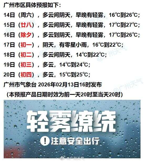 16日(除夕),粤北阴天有小雨,其余市县多云到阴天,夜间转小雨;早晨西部市县和粤西海面局部有大雾;白天最高气温:韶关、清远18~23℃,其余市县25~29℃;最低气温:韶关及清远的北部市县10~13℃,粤西、粤东和珠江三角洲中南部市县17~20℃,其余市县14~17℃。