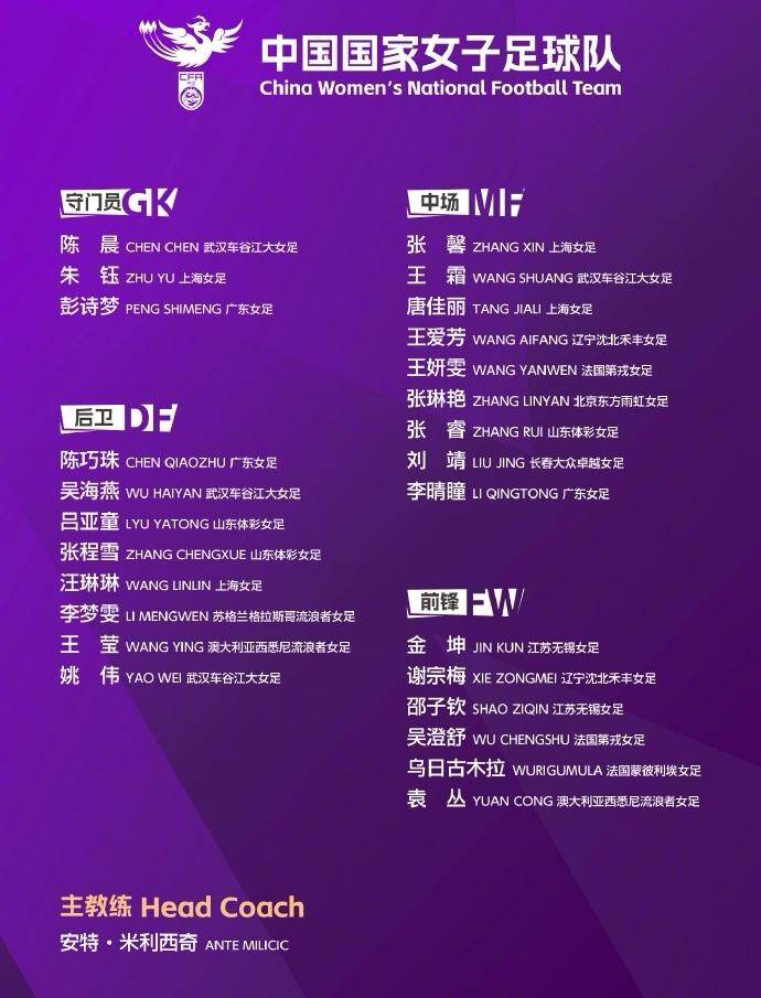 守门员:陈晨(武汉车谷江大女足)、朱钰(上海女足)、彭诗梦(广东女足)