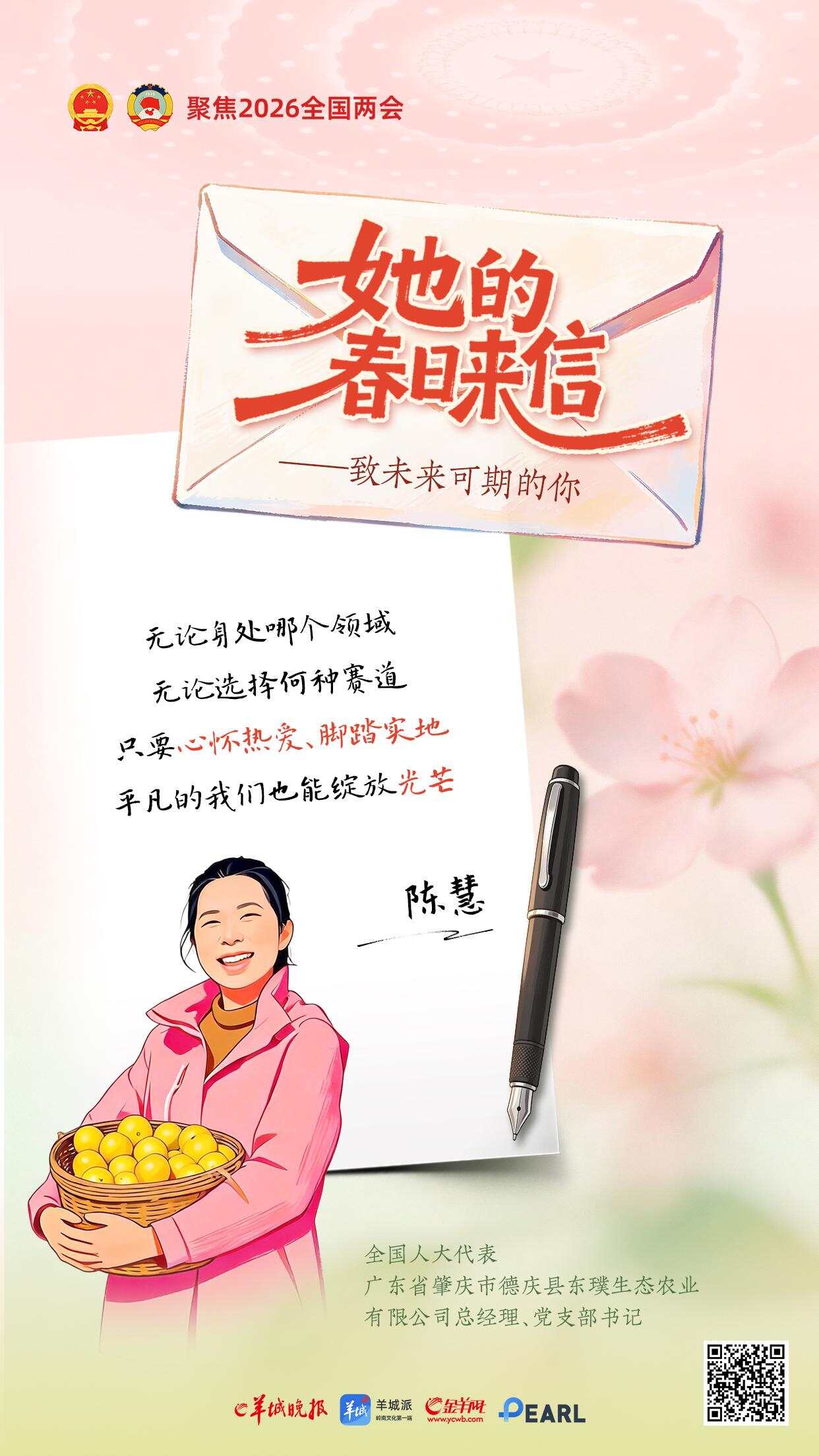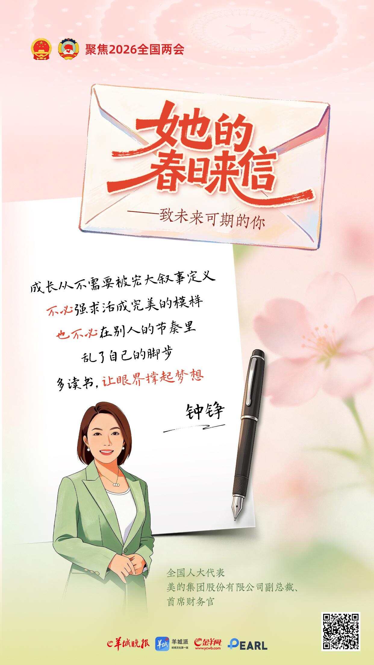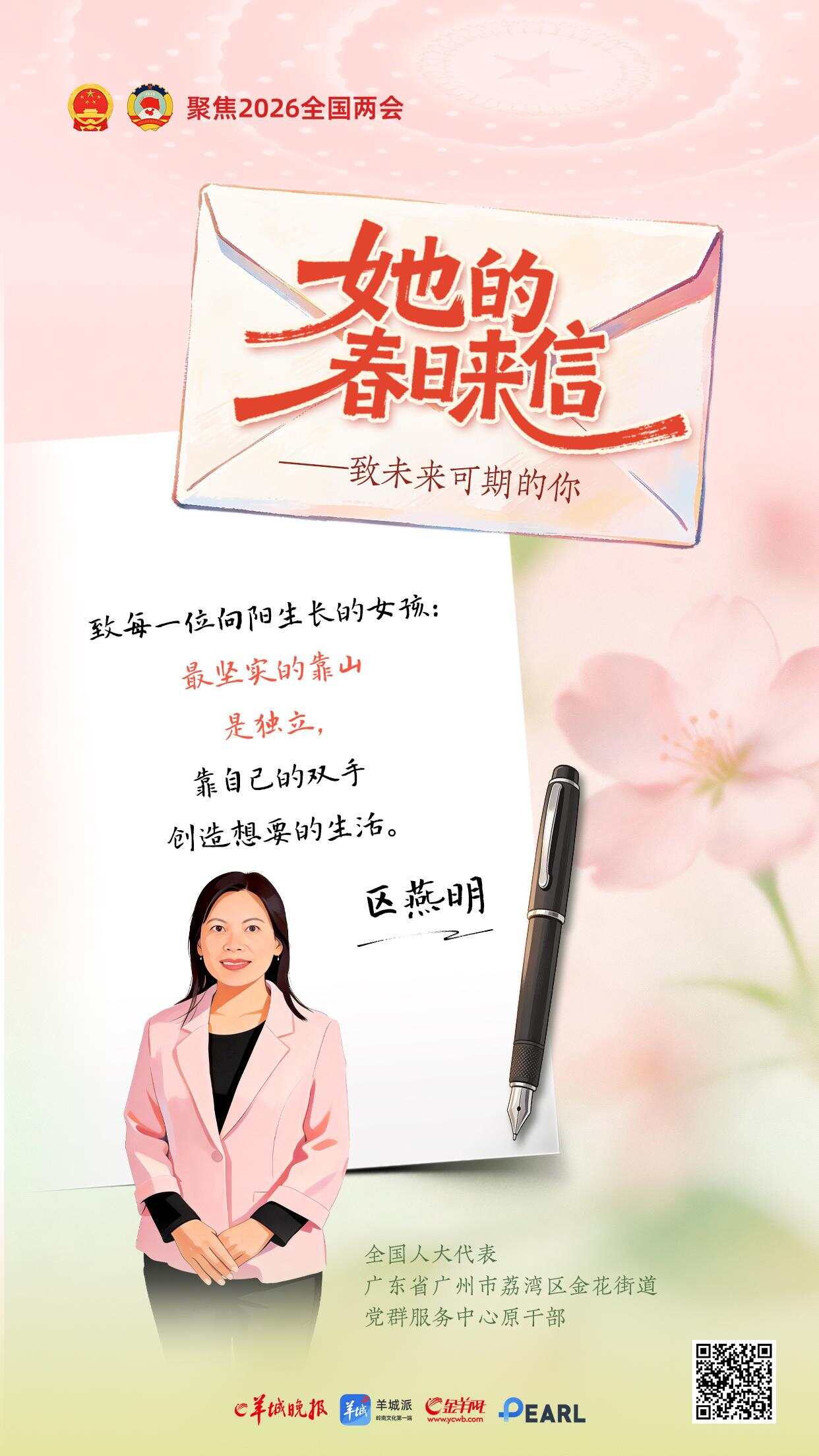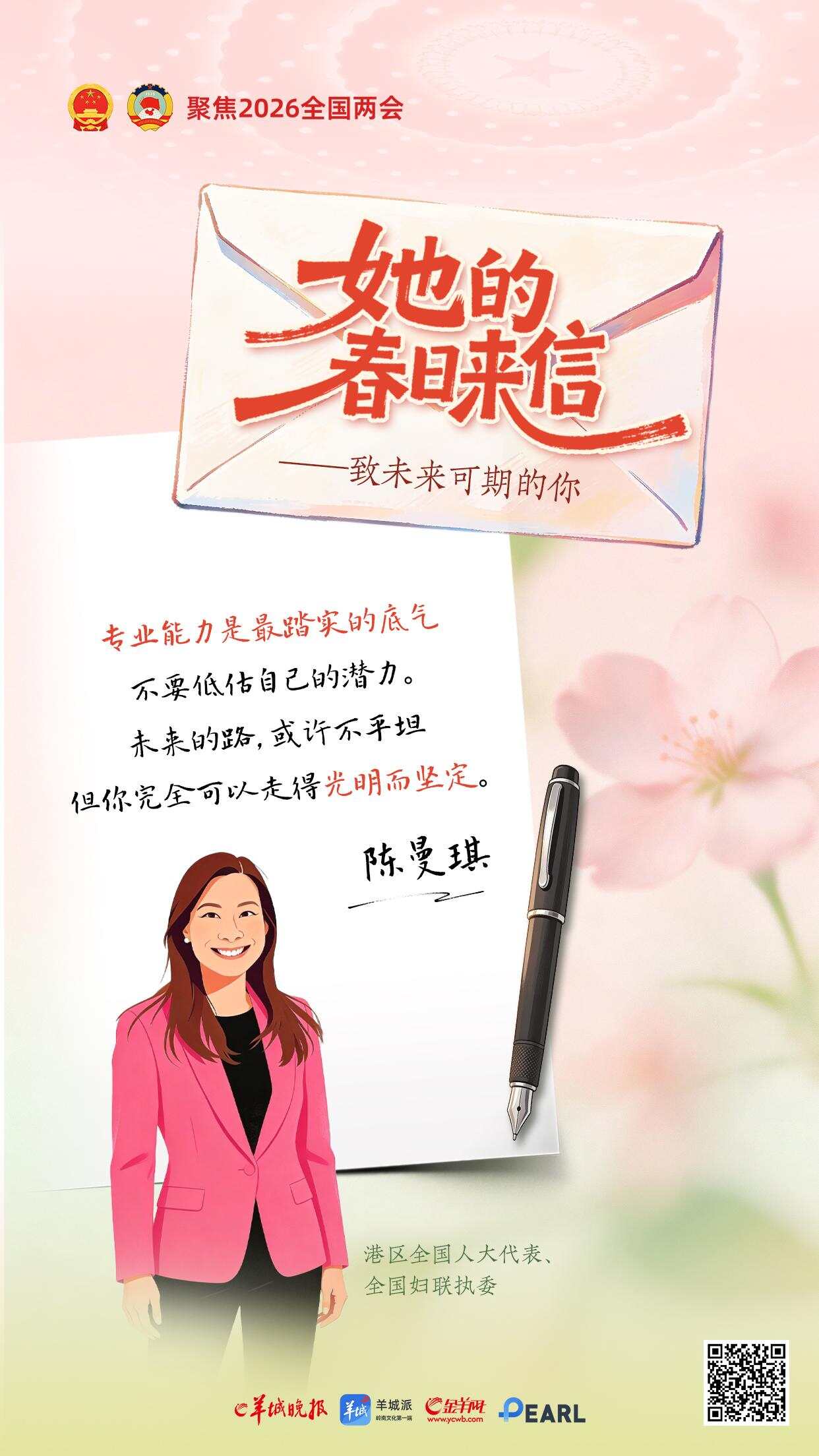 三月春光正好。一年一度的“三八”国际劳动妇女节与全国两会如约而至。在这个属于所有女性的节日里,羊城晚报推出《她的春日来信——致未来可期的你》特别策划,邀请八位在各自领域闪闪发光的全国人大代表,提笔为女孩们写下寄语。
