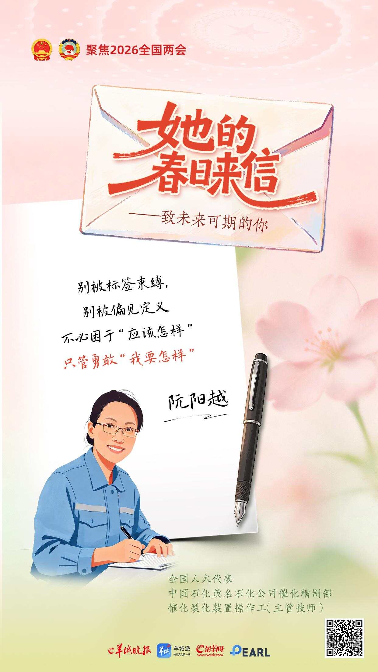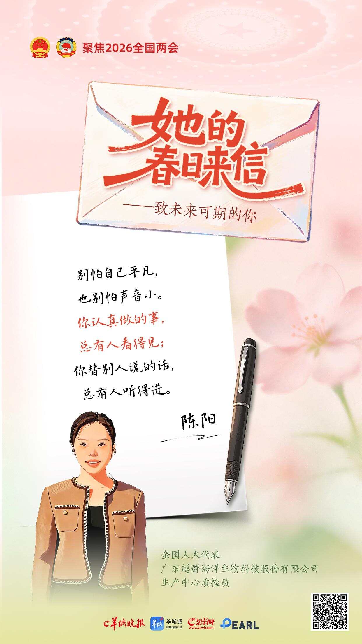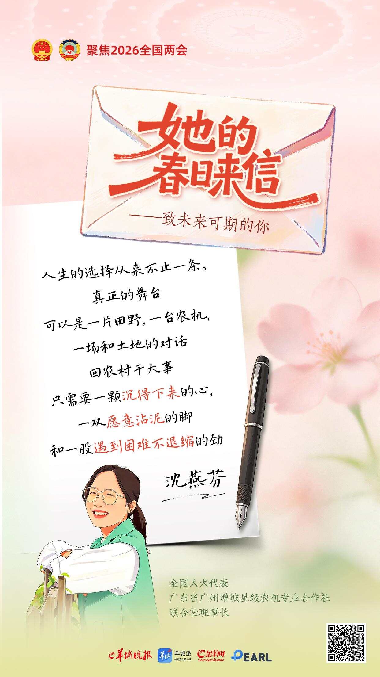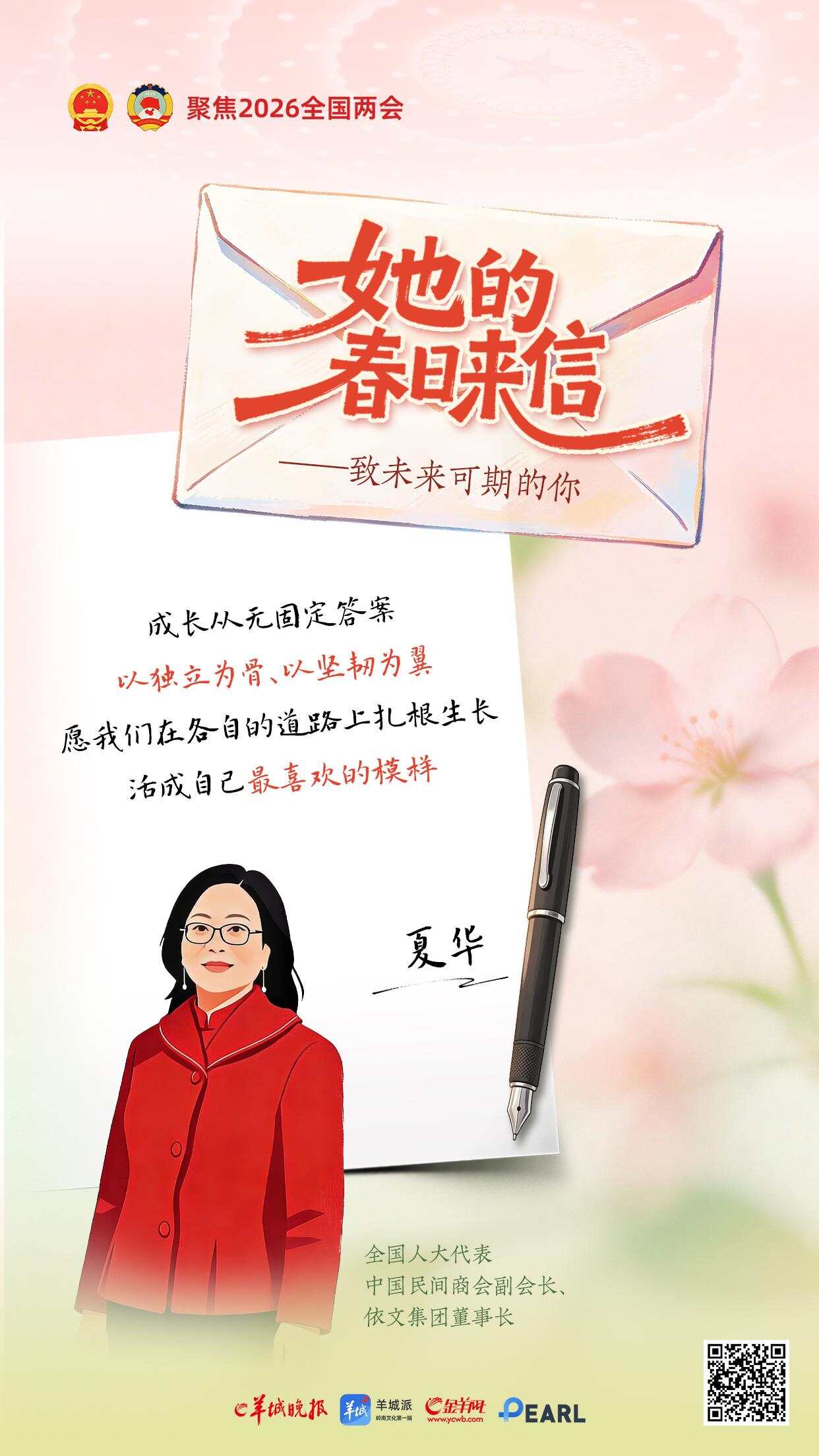 三月春光正好。一年一度的“三八”国际劳动妇女节与全国两会如约而至。在这个属于所有女性的节日里,羊城晚报推出《她的春日来信——致未来可期的你》特别策划,邀请八位在各自领域闪闪发光的全国人大代表,提笔为女孩们写下寄语。