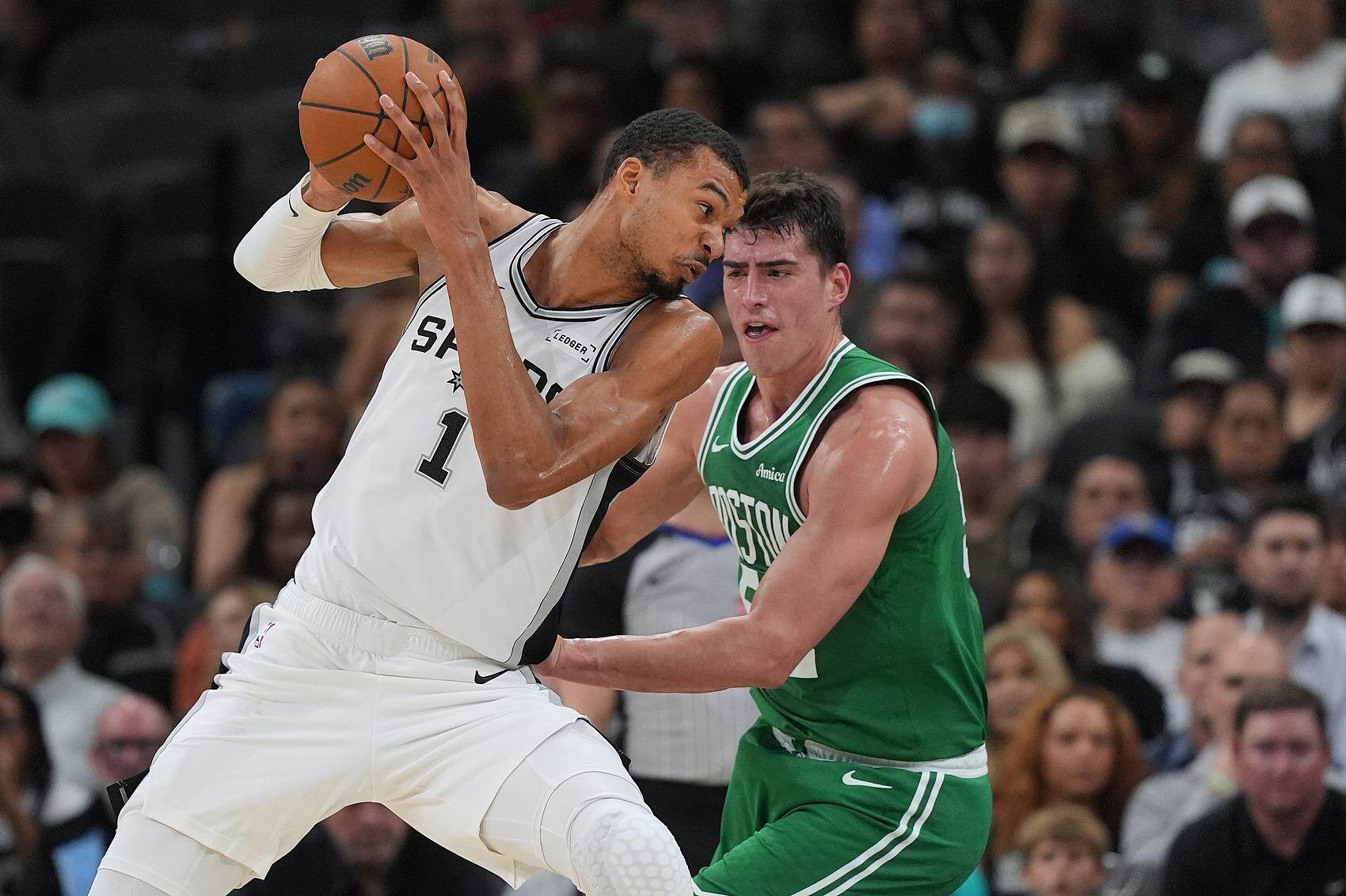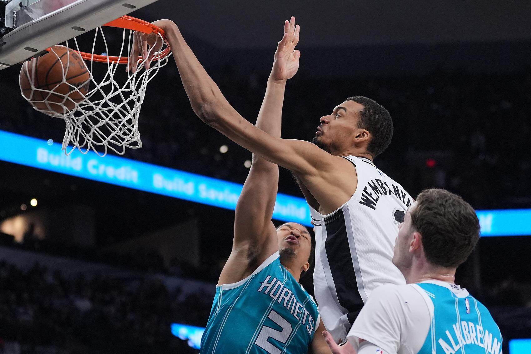 更可怕的是他的进化速度。在近期比赛中,他的进攻手段展现出了前所未有的多样性。对森林狼一战,他像后卫一样面筐突破;对爵士一战,他玩出了约基奇+穆雷式的反向挡拆后直拔三分;对阵黄蜂的比赛中,文班亚马在开场后连续制造黄蜂首发中锋迪巴亚特犯规,彻底打乱黄蜂内线轮换次序,从而为马刺取胜奠定基础。当一位2米24的球员能在挡拆后像克雷·汤普森一样切出投篮,像杜兰特一样干拔,又能依靠自身灵活性和假动作欺骗对手时,针对他的任何防守已然失去意义。