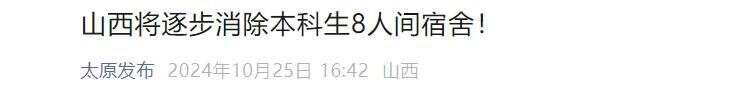 《山西省高校学生宿舍建设方案》明确,5年内基本缓和高校学生宿舍供需矛盾,逐步消除全省高校本科生8人间,显著降低本科生6人间、硕士研究生和博士研究生4人间占比。
