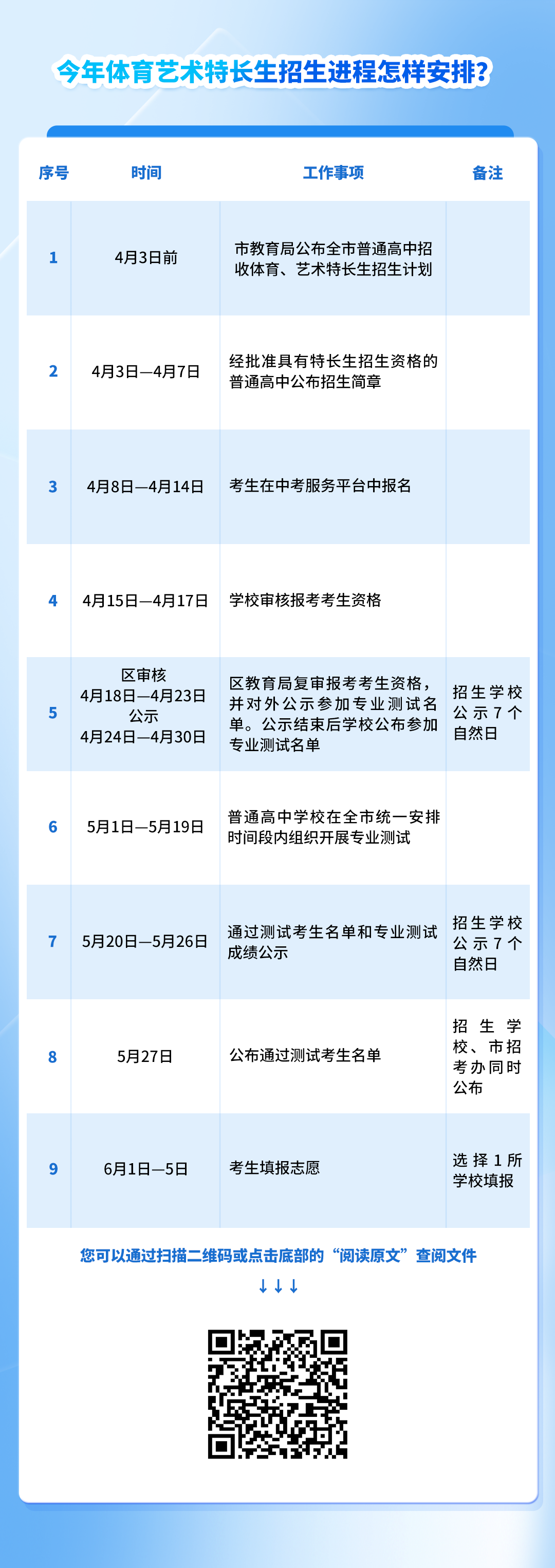 四是录取办法为学生中考成绩达到学校设定的特长项目录取最低控制分数线后,采取“学业水平考试成绩+专业测试成绩”的结构化成绩方式,按合成分数从高到低顺序录取。其中体育类初中学业水平考试成绩占40%、专业测试成绩占60%;艺术类初中学业水平考试成绩占50%、专业测试成绩占50%。五是学生选择一所学校的一个项目作为志愿填报不变,报考体育艺术特长生基本条件不变,招生工作流程不变。