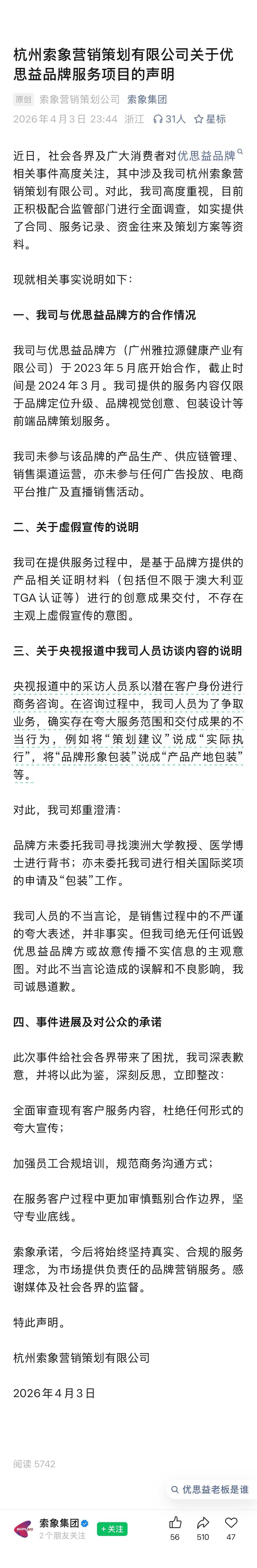 4月3日晚11点多,优思益营销策划公司索象营销在其官方公众号发布声明,就此前被指出的涉嫌虚假宣传、商业欺诈等内容进行说明。