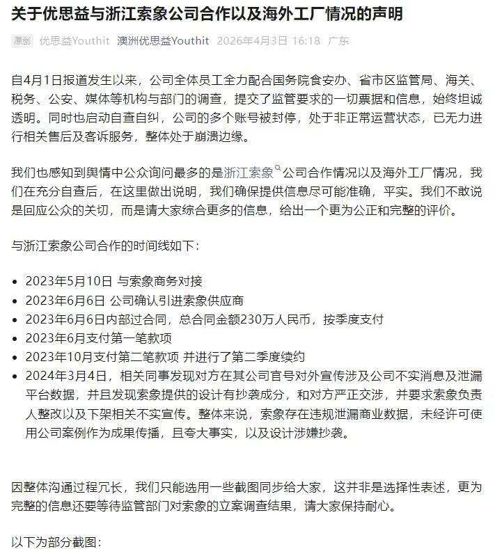 4月3日下午,优思益就相关情况发布声明。