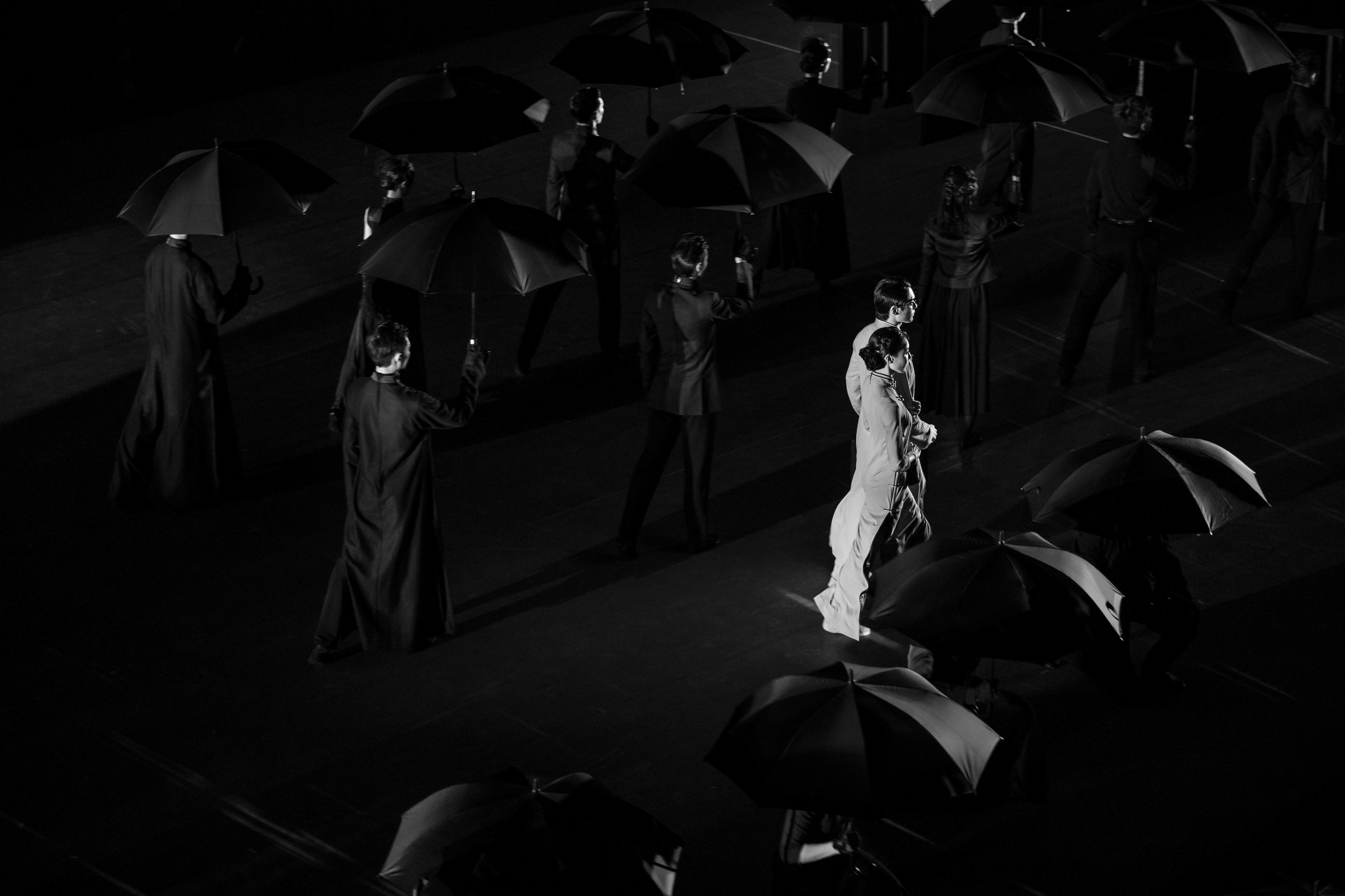 舞剧开创性地将谍战叙事融入舞蹈编排,让肢体语言具备叙事功能。总编导韩真、周莉亚在创作中运用倒叙、插叙、平行蒙太奇等电影化手法,将舞蹈从 “表现” 提升至 “叙事” 高度。剧中的 “旗袍店群舞” 融合中国古典舞的含蓄与现代舞的力度,蒲扇的动作设计暗含人物身份转变与悬念铺垫;“雨伞舞” 则凭借精妙的群体调度,以黑伞的开合演绎追捕、交锋等情节,将舞蹈的观赏性与叙事性完美融合。