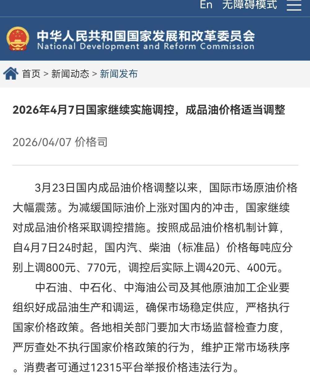 记者从国家发展改革委了解到,自4月7日24时起,国内汽、柴油(标准品)价格每吨上调420元、400元。
