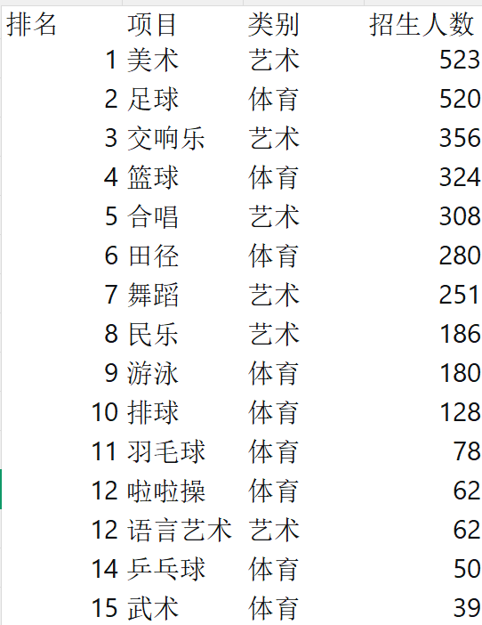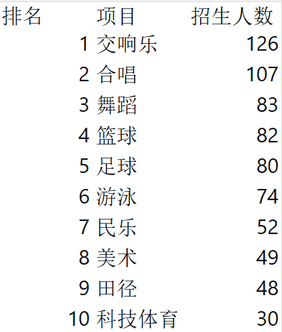 交响乐(356人)、篮球(324人)、合唱(308人)、田径(280人)、舞蹈(251人)等传统大项紧随其后,共同构成特长生招生的主体框架。