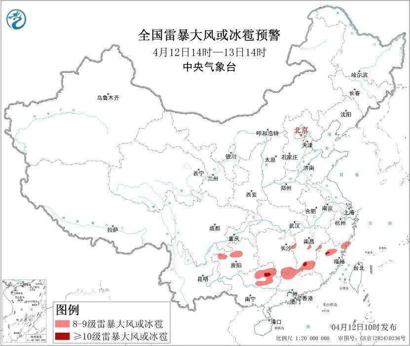 中央气象台4月12日10时继续发布强对流天气蓝色预警:预计4月12日14时至13日14时,江南中南部和东部、华南北部、西南地区东部等地的部分地区将有8级以上雷暴大风或冰雹天气,其中,江西南部、福建中北部、广西北部等地部分地区将有10级以上雷暴大风,最大风力可达11级以上;江南中南部和东部、华南北部、西南地区东部等地的部分地区将有小时雨量大于20毫米的短时强降水,其中,江西中南部、广西东北部等地的部分地区小时雨量大于50毫米。