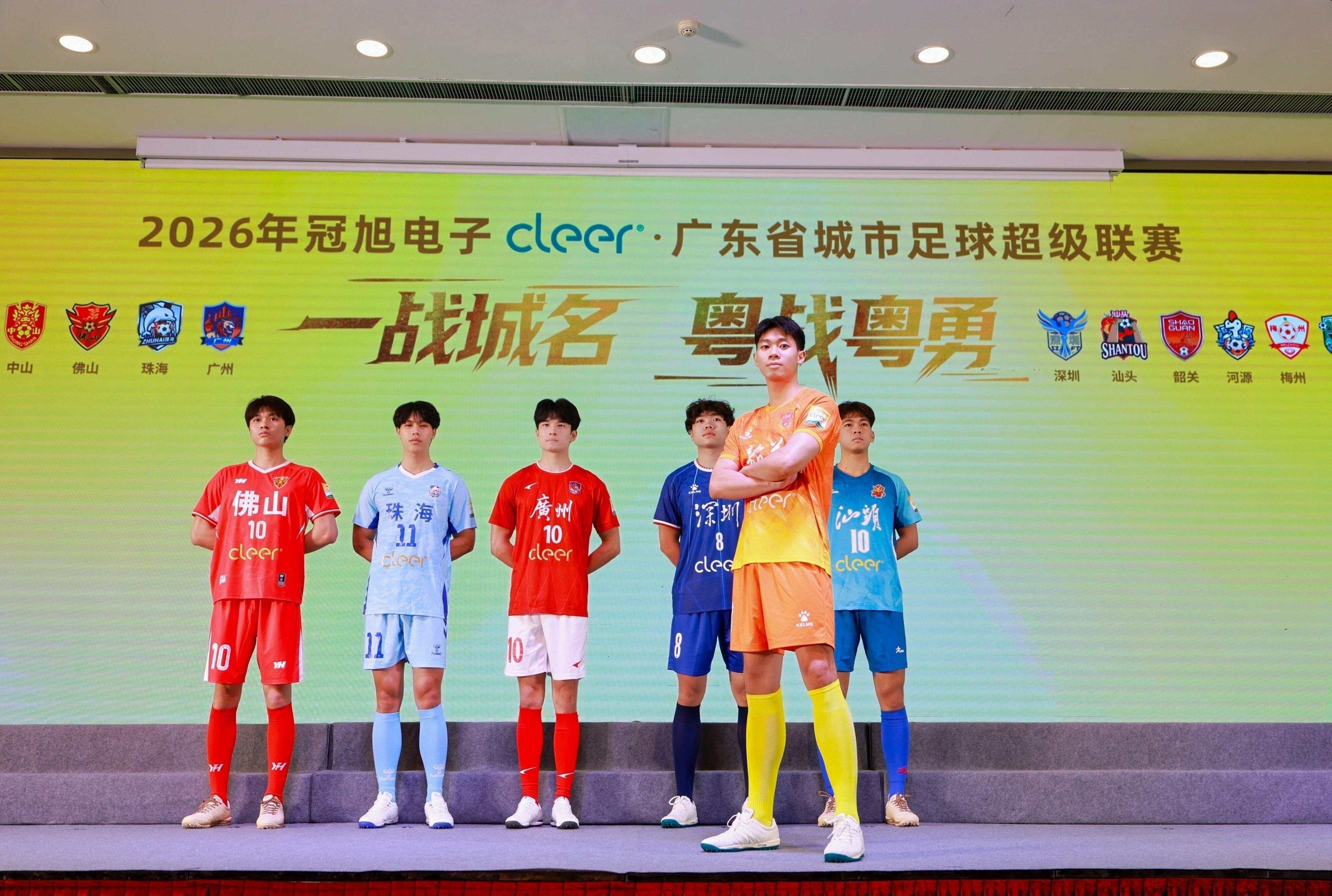 4月13日,2026年广东省城市足球超级联赛新闻吹风会在广州举行,广东21个地市代表队比赛服闪亮登场。方寸球衣,藏一城风骨,上身即战袍,上场即荣光!21名“肌肉男”战袍加身,走起炫酷T台秀,将粤超仪式感拉满。放眼全场,赤、橙、黄、青、蓝、紫等各色球衣交相辉映,将岭南城市的多元气质和现代美学展现得淋漓尽致。而有细心的球迷发现,21支球队主场球衣色彩百花齐放,唯独不见绿色(湛江客场球衣为绿色),这一趣味细节,也让21城球衣发布多了一层话题。
