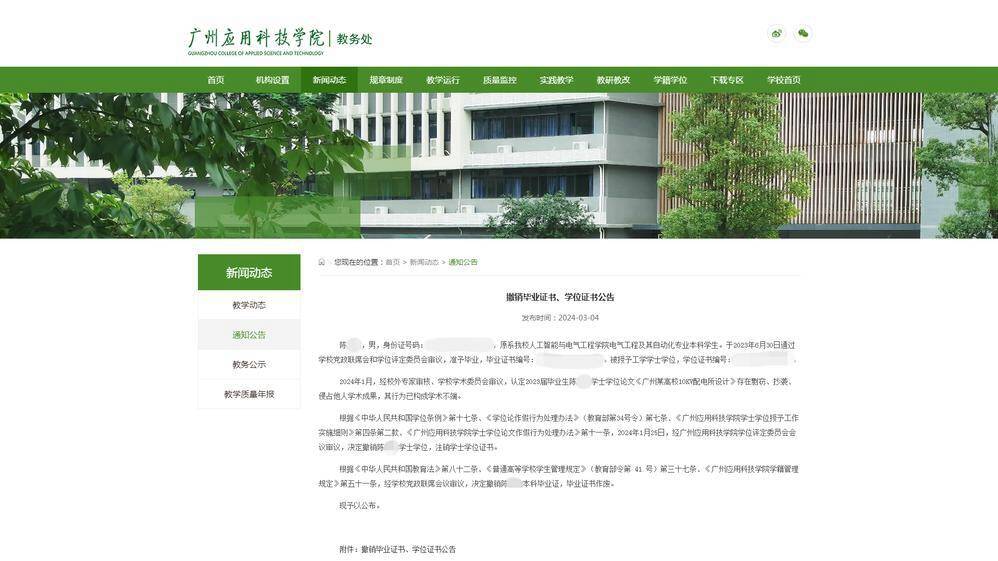 近日,广州应用科技学院发布《撤销毕业证书、学位证书公告》称,该校2023届本科毕业生陈某因学士学位论文剽窃,被撤销学士学位和毕业证书。