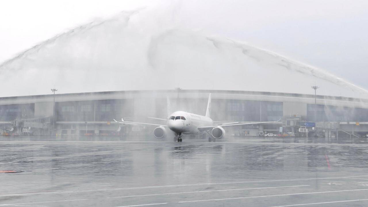 【金羊早晚报】白云机场水门礼迎接!国产大飞机C919亮相“沪广快线”