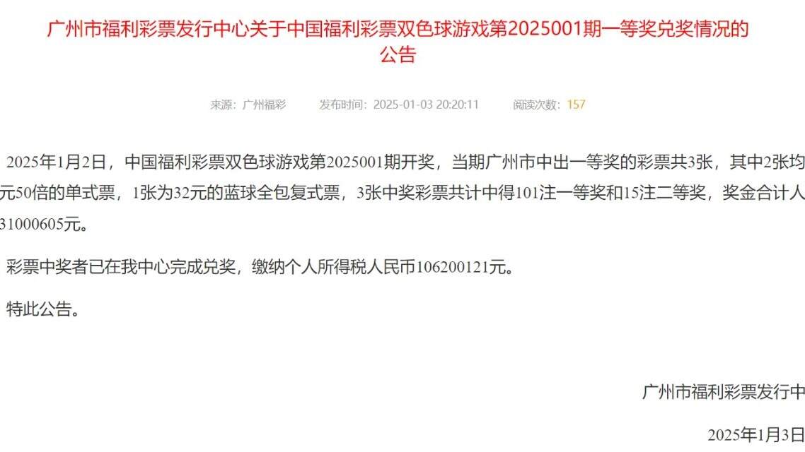彩票中奖者已在广州市福利彩票发行中心完成兑奖,缴纳个人所得税人民币106200121元。