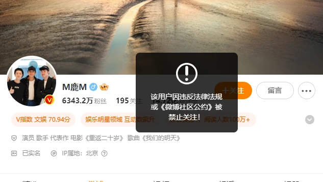 近日,不少网友发现鹿晗的多个平台社交账号被禁止关注,理由为“该用户违反法律法规”。此事曝光后在网上引起热议。