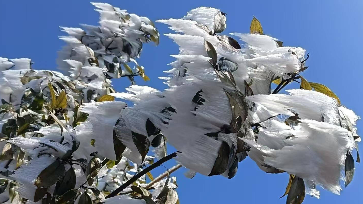 近日,韶关乐昌市迎来了明显降温,记者来到乐昌庆云镇原祖山山顶,发现路面暂无结冰现象,但枝叶间已然挂满晶莹剔透的冰挂,仿佛镀上了一层透明的琉璃,阳光透过冰晶闪闪发光,宛如一幅静谧美丽的冬日画卷。