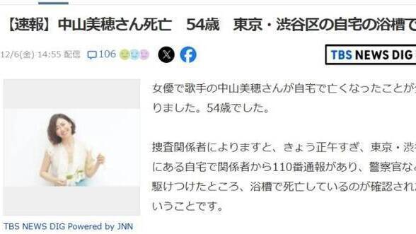 近日,日本演员中山美穗去世,终年54岁。警方接到报警后前往其住所时,发现她已在浴缸中离世。