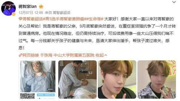 近日,艺人蒋智豪父亲在其账号发声求助,称其9月底突然昏迷,在ICU顽强抗争一个月才转到普通病房,现在情况稳定,但仍需持续治疗,恳请大家伸出援手。