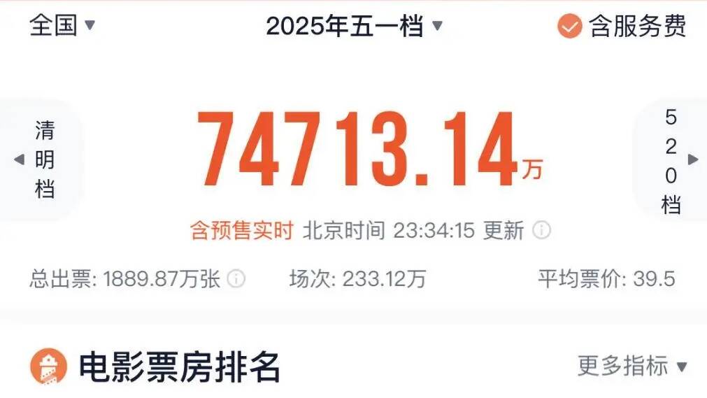 2025年五一档(5月1日-5月5日)以总票房近7.5亿元收官,观影人次1889万,场次233.5万场。