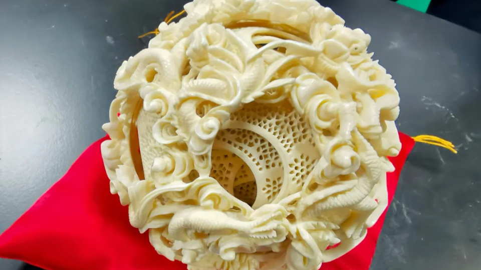 近日,广州海关在进境寄递渠道查获1件象牙雕刻工艺制品“鬼工球”,净重290克。