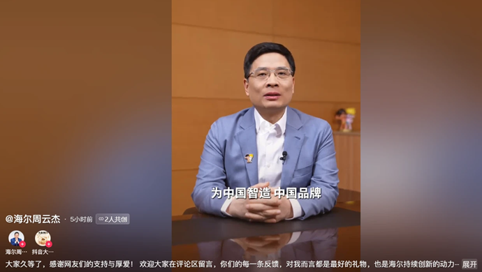 3月21日,海尔CEO周云杰第一条社交平台的视频发布,粉丝已超五十万。