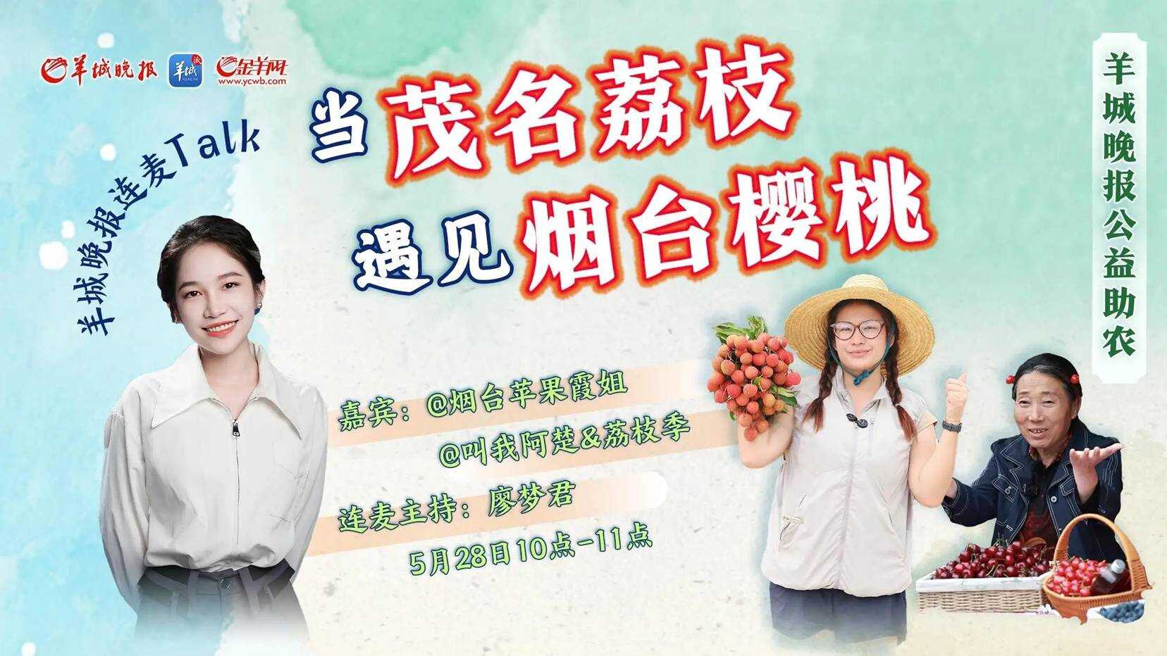 羊城晚报主持人将与来自广东茂名的荔枝主播阿楚,以及来自山东烟台会讲英文的霞姐,利用1小时的时间,聊一聊荔枝和樱桃,以及她们的故事。