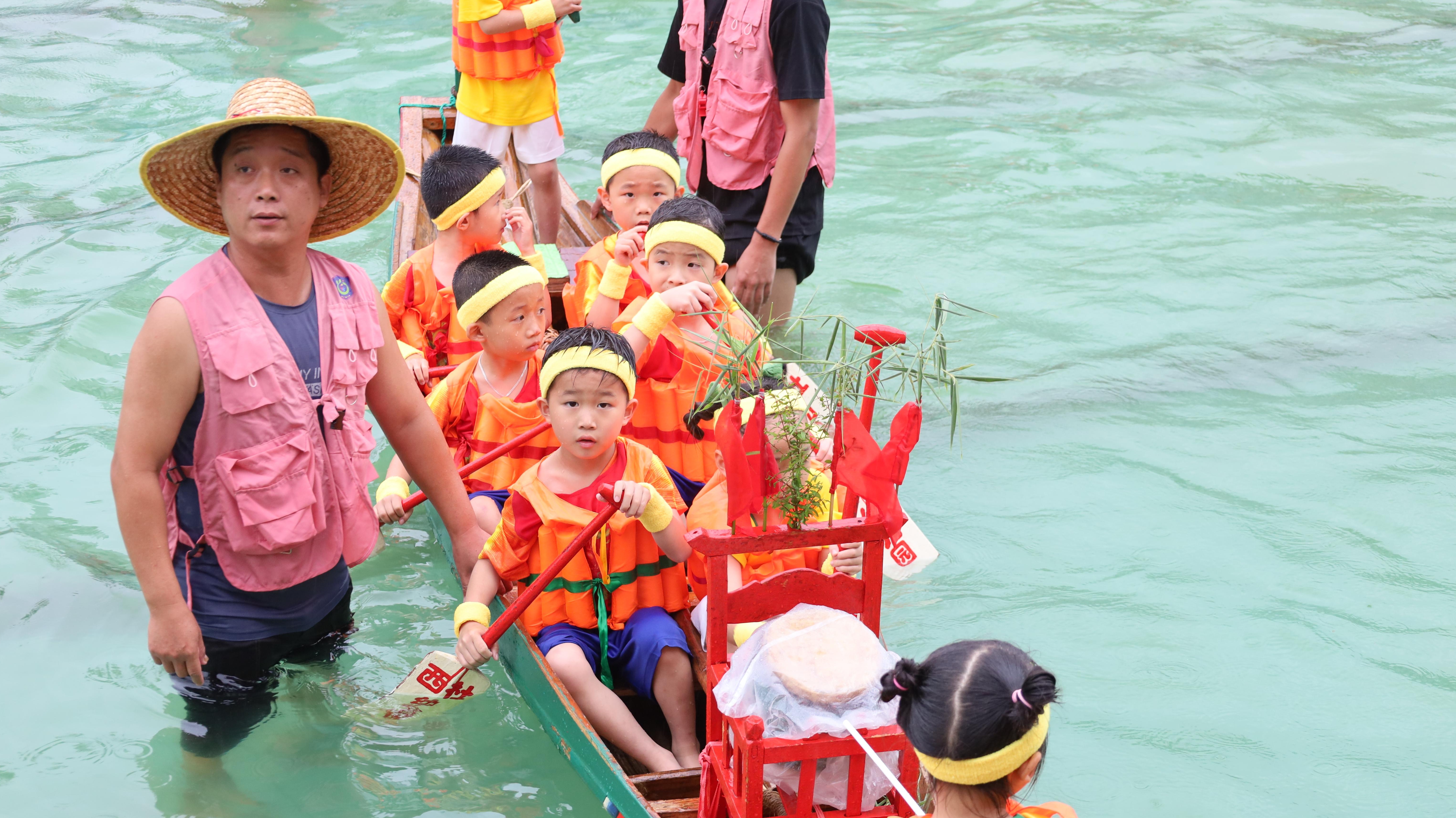 鼓声阵阵,水花飞溅,一群头绑红色发带、身穿橙色救生衣的幼儿园娃娃们,坐在小龙舟里奋力挥动小浆,小龙舟手的吆喝声和同学们的加油声此起彼伏……