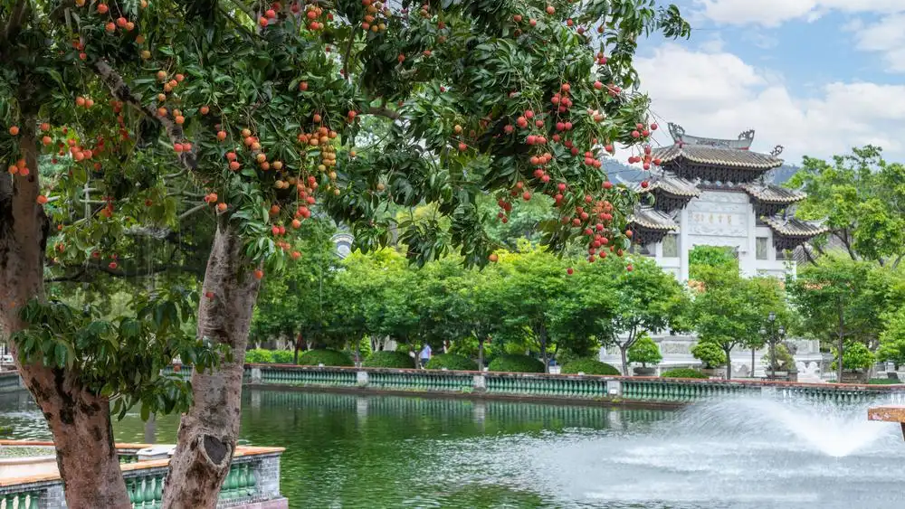 仲夏蝉鸣起,岭南荔枝红。近日,宝墨园内百余株荔枝树迎来成熟季,桂味、怀枝、妃子笑等岭南名种缀满枝头,红艳似火。