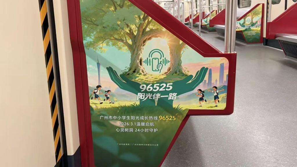 近日,三列印有广州市中小学生阳光成长热线“96525”与心灵树洞插画的品牌列车,分别驶入广州地铁1号线、5号线、6号线,穿行于天河CBD与老城区之间;花城广场的巨幕公信屏亮起“96525,阳光伴一路”的公益标语。