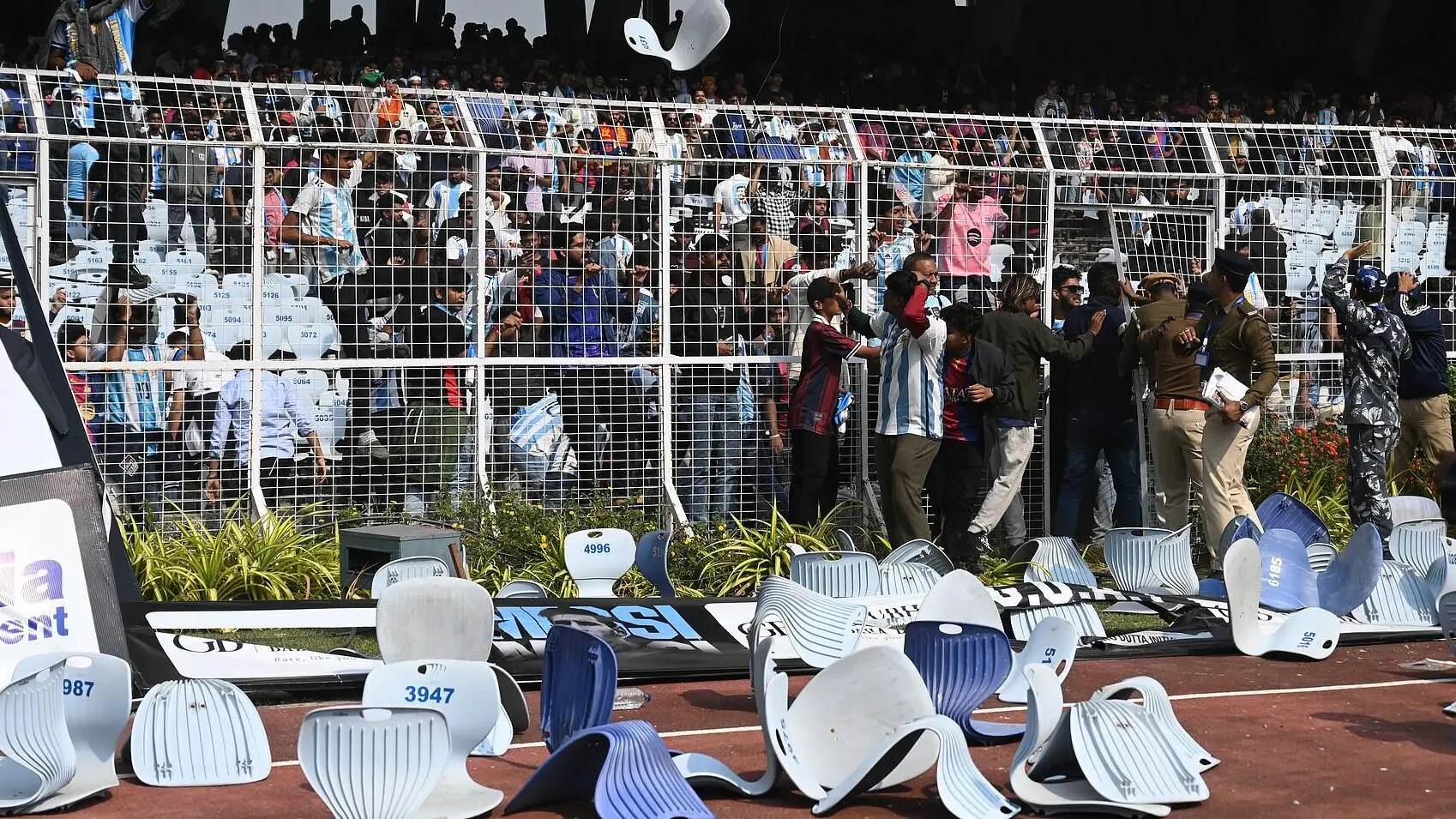 梅西来到首站加尔各答的盐湖体育场,与现场的球员及球迷互动。由于组织混乱,梅西在现场只停留了10分钟左右就被组织方带离。
