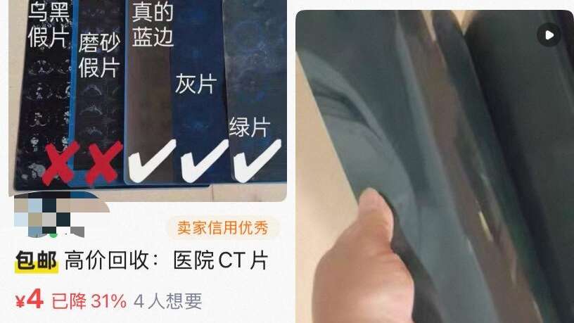 近期,在一些二手交易平台上,出现了不少收购废旧医用胶片的信息。有人主动出售:“71张,200元包邮。”这些原本记录患者骨骼、器官影像的CT片、X光片,正在被买家批量收购。