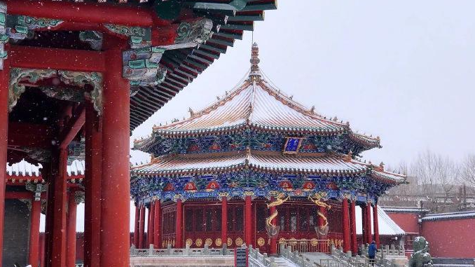 近日,小寒刚过,沈阳故宫博物院迎来2023年第一场雪,“白雪镶红墙”的景致美不胜收。